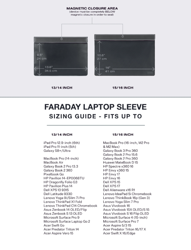 The Faraday Laptop Sleeve provides the ultimate layer of protection for your personal data. Crafted with patented signal-blocking technology, this sleeve creates a virtual wall that blocks external signals and digital threats, such as hackers, from remotely gain access to your laptop and personal information. Even closed your laptop is never really off. Its sleek design ensures that you can confidently carry your laptop, knowing that your most valuable asset is protected, all while maintaining a stylish discreet appearance.