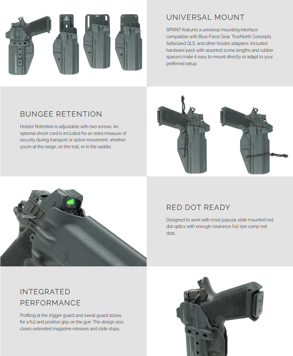 Unapologetically optimized for what we want shooters to do the most: training and shooting at the range. The SPRINT is red dot and suppressor-height sight compatible, and made from thick .125" Kydex with enough room for extended mag release and slide stops.